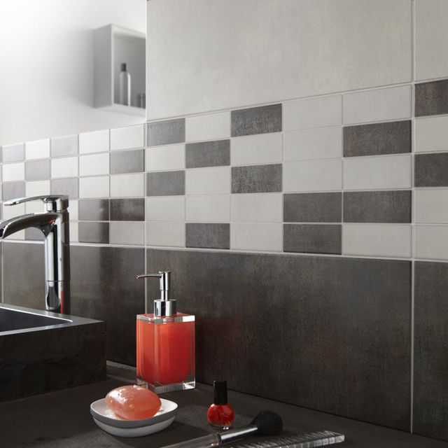 20×50 Metalica chrome pasta roja mate no rectificado. Mosaico y rodapié disponible en chrome. Packing: 1,2 m2 por caja; 12 piezas por caja; 48 cajas por palet, 57,6 m2 por palet